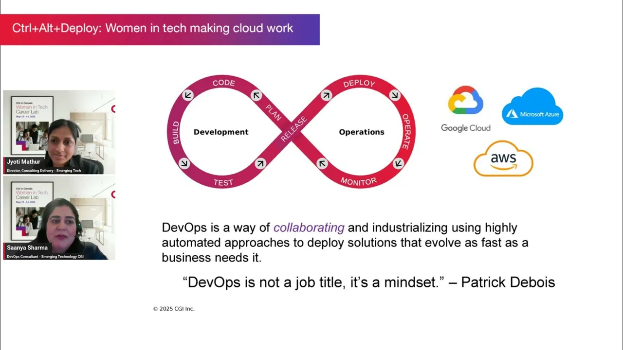 Thank you for joining Jyoti and Saanya for an engaging session on how CGI is transforming industries through DevOps, Cloud, FinOps, and SRE. They shared real-world project stories that demonstrated tangible business results and showed how these cutting-edge solutions drive faster releases, boost system resilience, and deliver measurable impact.Whether participants were just starting their tech journey or looking to level up, the session highlighted why a career in DevOps and Cloud at CGI offers endless opportunities to innovate, grow, and make a real difference.