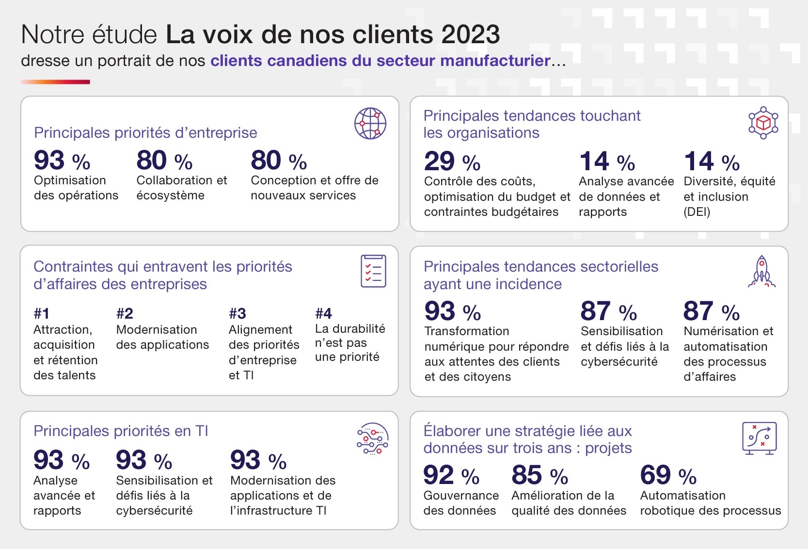 Les résultats de La voix de nos clients 2023, illustrés dans le graphique suivant, montrent que la priorité absolue de la grande majorité des entreprises du secteur manufacturier d’aujourd’hui reste l’optimisation des opérations, comme elle l’a été au cours des dernières années. Les autres grandes priorités citées sont l’amélioration de la collaboration au sein de l’écosystème de la chaîne d’approvisionnement et l’offre de produits ou services adéquats pour répondre aux besoins évolutifs de notre monde en constante évolution.