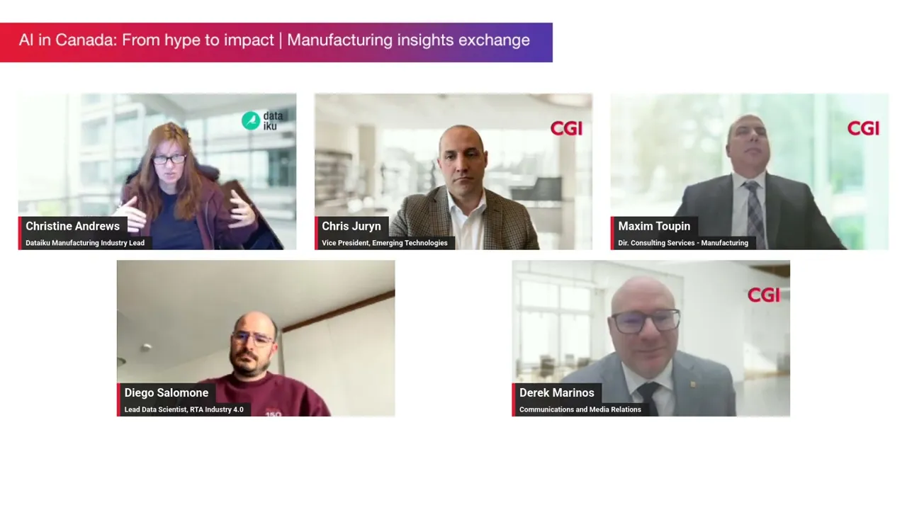 Les spécialistes de CGI (Maxim Toupin et Chris Juryn), Rio Tinto (Diego Salomone) et Dataiku (Christine Andrews) ont discuté de cas d’utilisation concrets, de recommandations pour accélérer l’adoption de l’IA et de stratégies pour trouver un équilibre entre l’innovation et le risque opérationnel.
