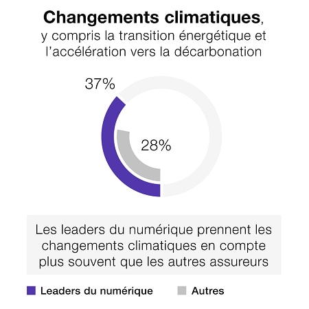 Notre recherche dans le secteur de l’assurance montre que les leaders du numérique prennent les changements climatiques en compte plus souvent que les concurrents qui tardent à réagir. Ils sont aussi plus avancés dans leur transformation numérique pour répondre aux attentes de leurs clients.