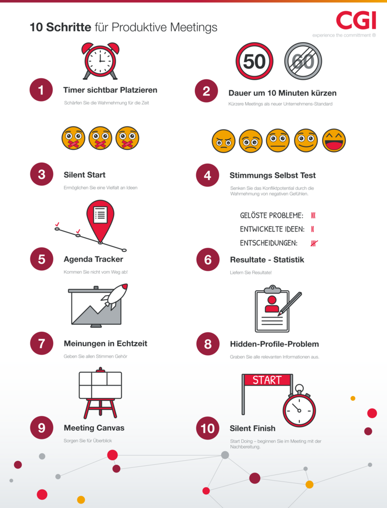 Und noch etwas: Eine Meeting-Werkzeugkiste lohnt sich für alle, die sehr häufig Besprechungen leiten. Hier finden Uhr/Sanduhr, Vordrucke zu Agenda-Tracker und Meeting-Canvas, Visualisierungen zum Stimmungs-Selbsttest etc. Platz und sind jederzeit greifbar. Möchten Sie Kollegen ermutigen, Neues auszuprobieren, dann beschenken Sie sie doch einfach mit unseren 10 Tipps für produktive Meetings, die Sie hier herunterladen können.