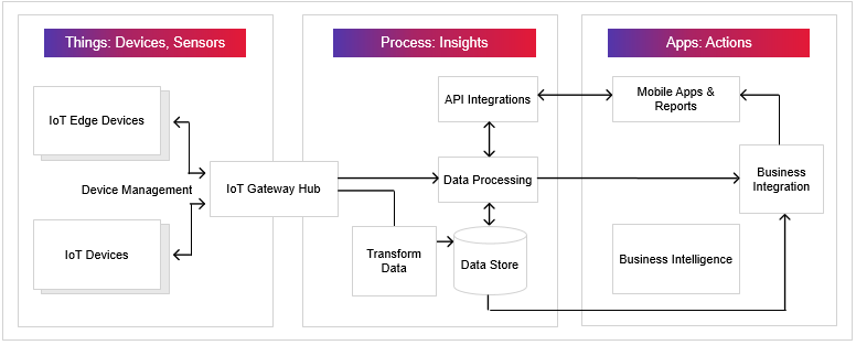 - Eine "Anwendungs"-Ebene, welche die Kontrolle an die Benutzer weitergibt und es ihnen ermöglicht, die Vorteile der IoT-Technologie zu nutzen und Geschäftsanforderungen zu erfüllen.