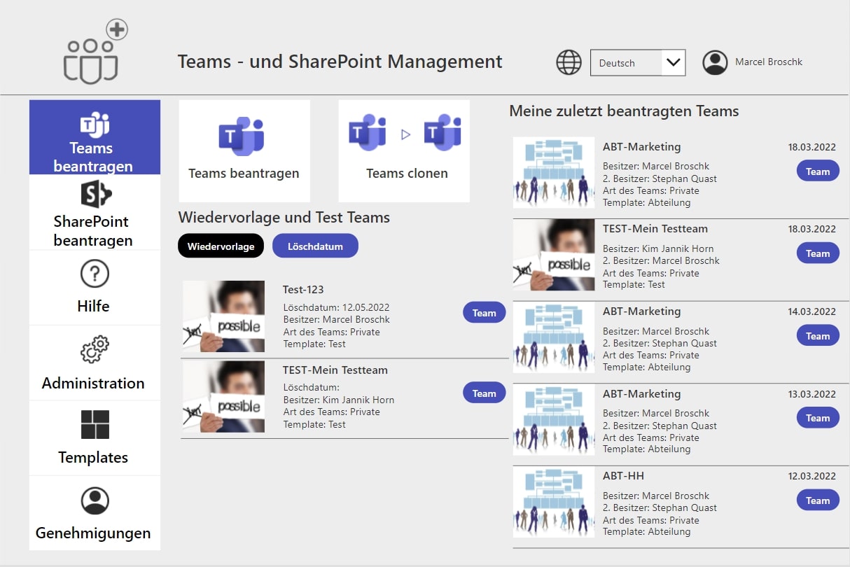 - SharePoint Site Beantragung: Auch benötigte SharePoint Sites können nach Wahl eines Templates direkt von den Nutzern beantragt werden.