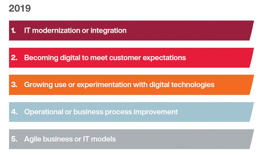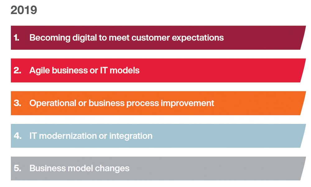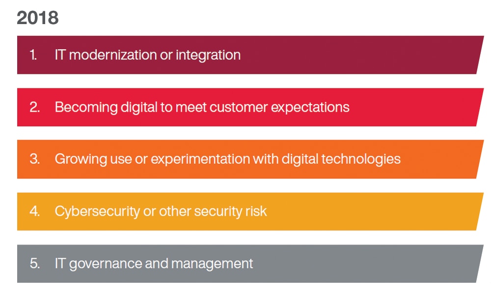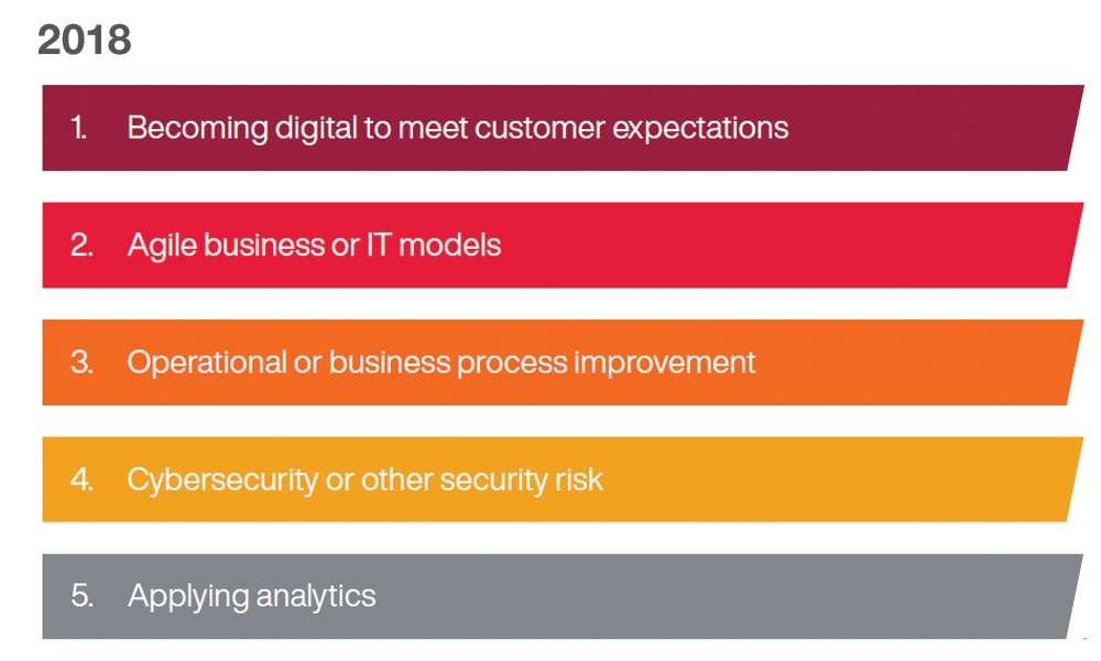 I 2018 vurderede lederne det som vigtigst at blive mere digitale for at leve op til kundernes forventninger, efterfulgt af agile forretnings- og it-modeller og operationelle eller forretningsmæssige forbedringer. Cybersikkerhed og andre sikkerhedsrisici samt analytics udgjorde resten af årets liste over de fem vigtigste tendenser.