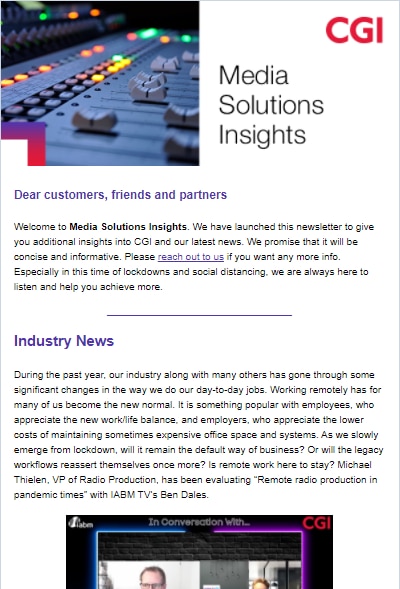 As TV meets radio and merges with online and social, CGI’s Media Solutions are at the heart of solving the challenges of modern broadcasters and radio stations. We offer solutions and services for professional radio workflows and media management, as well as the leading platform for newsroom and planning systems.