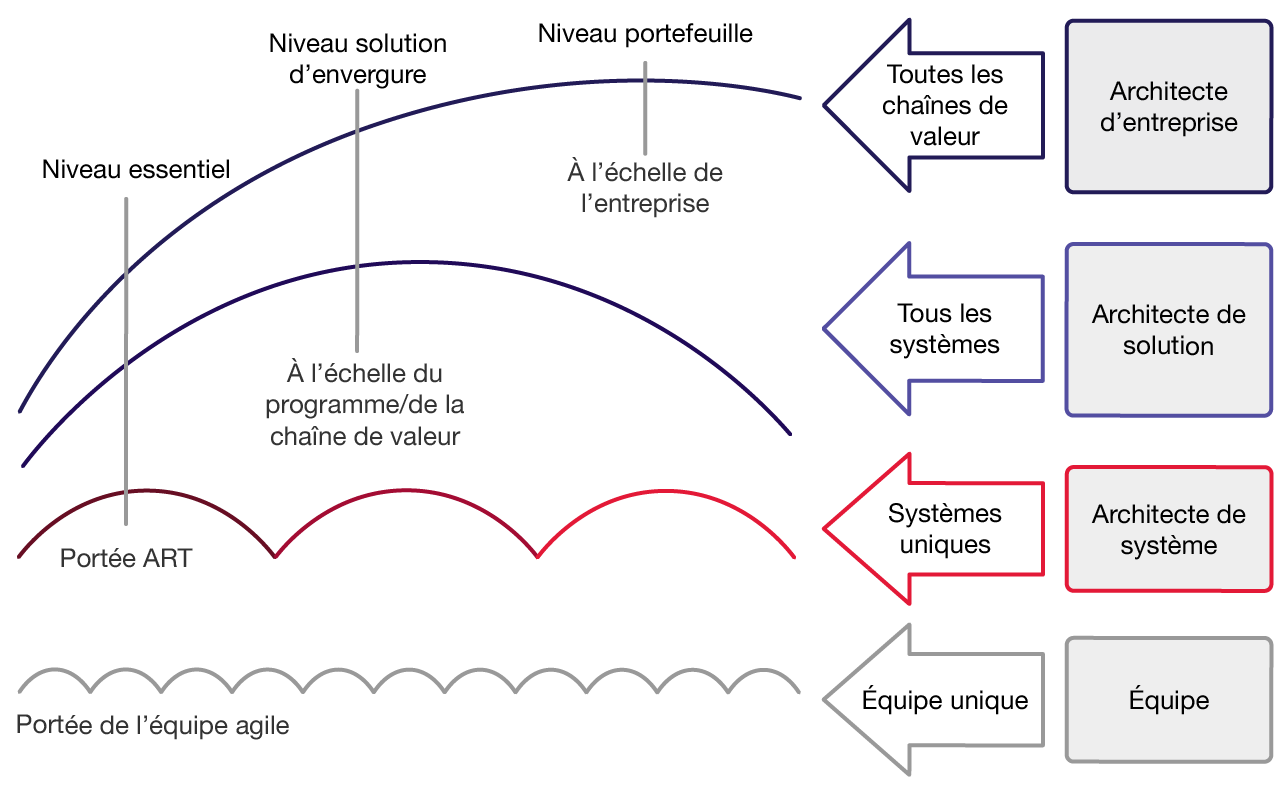 Le cadre SAFe prescrit des rôles d’architecte pour chacun de ces niveaux : architecte de systèmes, architecte de solutions et architecture d’entreprise.