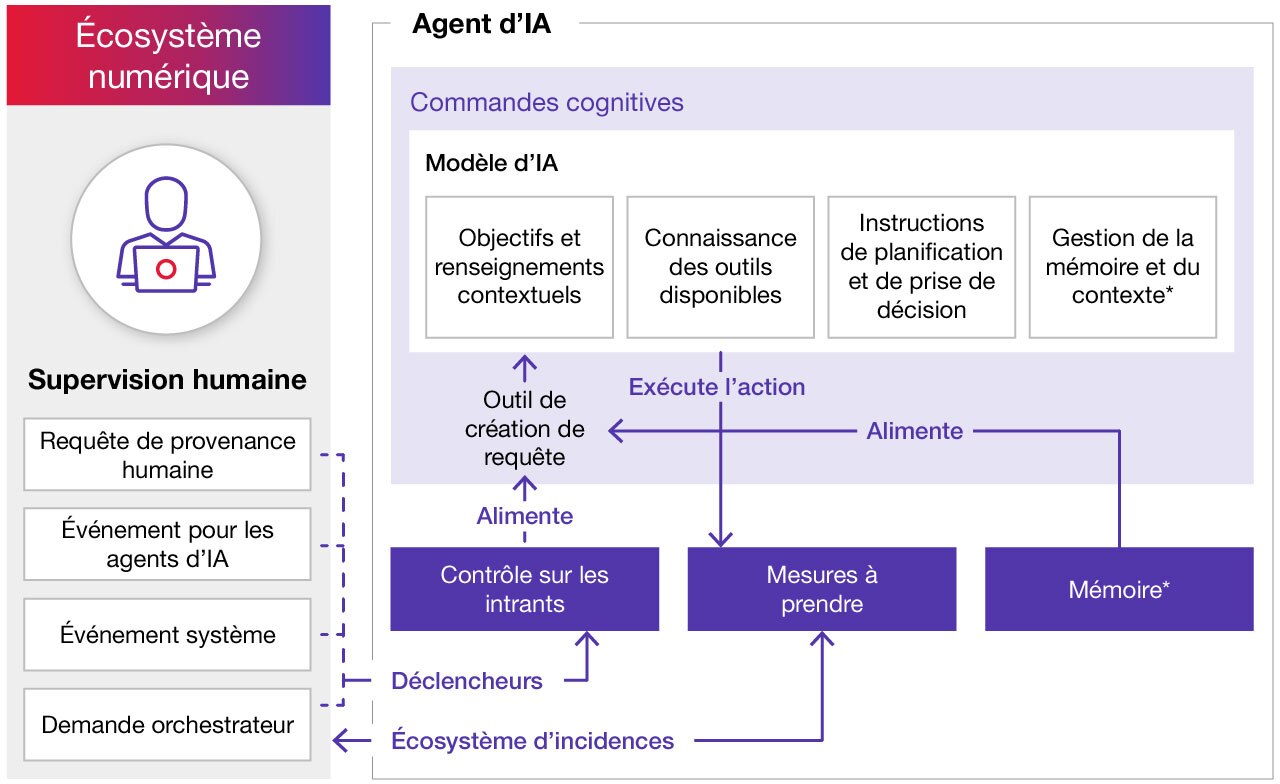 - Commandes cognitives – Il s’agit du « cerveau » de l’agent qui interprète les objectifs, élabore des stratégies, choisit les outils et effectue le suivi des décisions de façon dynamique en se basant sur des modèles externes et intégrés.