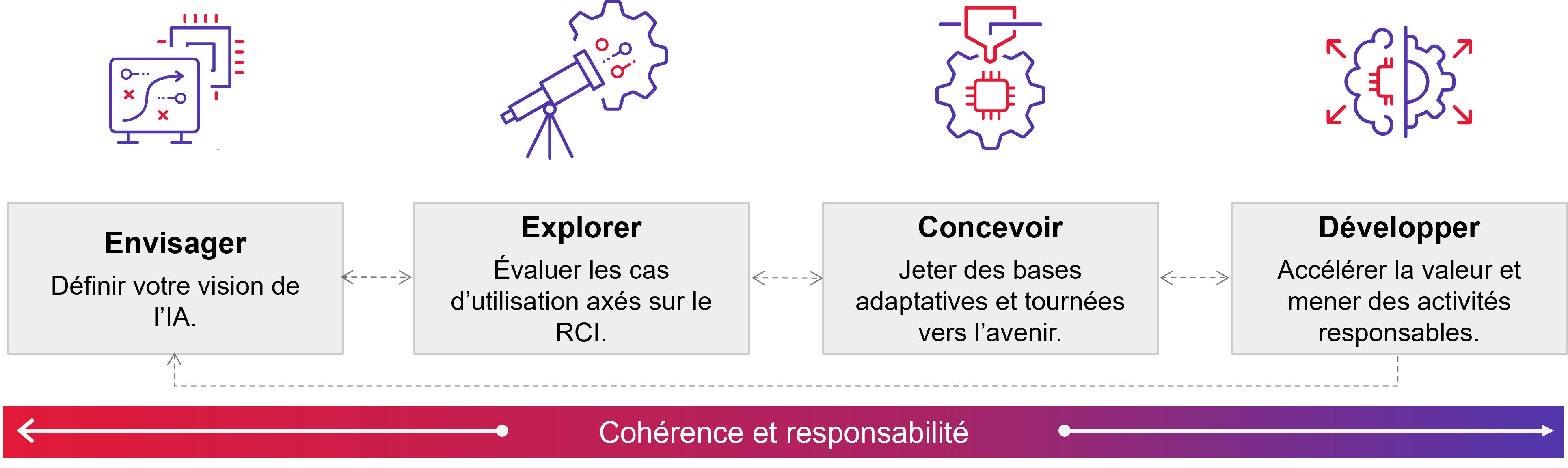Les dirigeants doivent définir leur vision de manière itérative, évaluer les cas d’utilisation basés sur le rendement du capital investi ainsi qu’étendre et exploiter un écosystème d’IA multimodèle. Il ne s’agit pas d’un processus linéaire. Certaines entités de votre entreprise peuvent se trouver à des stades différents. En outre, comme les écosystèmes continuent d’évoluer et l’IA de progresser, il est essentiel de disposer d’un cadre de gestion et d’une approche qui garantissent aux entreprises de produire rapidement de la valeur et des résultats.