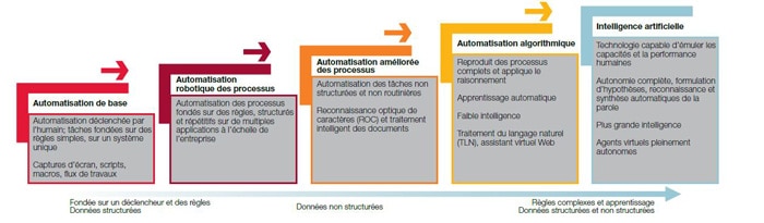 L’automatisation de base de séquences simples de tâches humaines est déjà utilisée depuis un certain temps. Plus récemment, l’utilisation de l’automatisation robotique des processus (RPA) pour des processus manuels à volumes élevés impliquant de multiples applications a gagné en popularité, entraînant une hausse de la productivité du personnel et une baisse des coûts. La prochaine étape logique est de combiner la RPA à des technologies de pointe telles que la reconnaissance optique de caractères (ROC), afin d’améliorer l’automatisation des processus pour des tâches plus complexes. Au-delà de cette étape débutent les algorithmes cognitifs pouvant imiter le raisonnement de base, et l’intelligence artificielle, qui déjà dans les environnements d’automatisation les plus avancés commencent à permettre à des agents virtuels d’émuler le raisonnement humain et l’empathie.