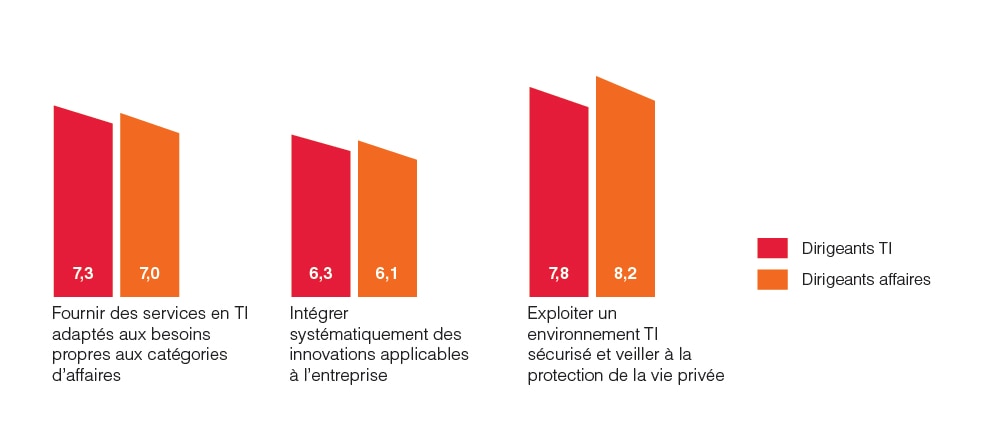 Pour une troisième année, nous avons demandé aux dirigeants des fonctions d’affaires (équipes métiers) et informatiques (TI) d’évaluer leur satisfaction au sein de leur propre organisation TI en fonction des 10 principaux attributs d’une organisation de TI de classe mondiale. Pour la plupart des attributs, les dirigeants des fonctions métiers indiquent des niveaux de satisfaction moins élevés à l’égard de leurs TI internes que les dirigeants des TI. L’intégration systématique des innovations reçoit la note moyenne la plus faible de 6,2, mais il s’agit tout de même d’une hausse de 0,7 point par rapport à 2019.