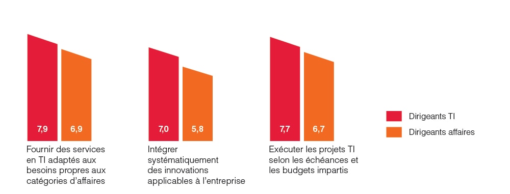 Pour une troisième année, nous avons demandé aux dirigeants des fonctions d’affaires (équipes métiers) et informatiques (TI) d’évaluer leur satisfaction au sein de leur propre organisation TI en fonction des 10 principaux attributs d’une organisation de TI de classe mondiale. Pour la plupart des attributs, les dirigeants des fonctions métiers indiquent des niveaux de satisfaction moins élevés à l’égard de leurs TI internes que les dirigeants des TI. L’intégration systématique des innovations affiche la note la plus basse de 5,8, note de 0,5 point inférieure à celle de 2019.