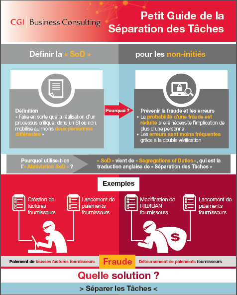 Dans ce contexte, mettre en place une démarche « SoD » est un excellent moyen de limiter ses risques tout en développant la culture du contrôle dans son organisation, à condition qu’elle soit toujours effectuée dans un souci d’efficience, pour ne pas impacter négativement l’activité de l’organisation. CGI, et notamment son activité conseil CGI Business Consulting, sont à la pointe des services en la matière, fournissant conseil, intégration d’outils adaptés à la « SoD », et outsourcing de la gestion de vos droits d’accès.