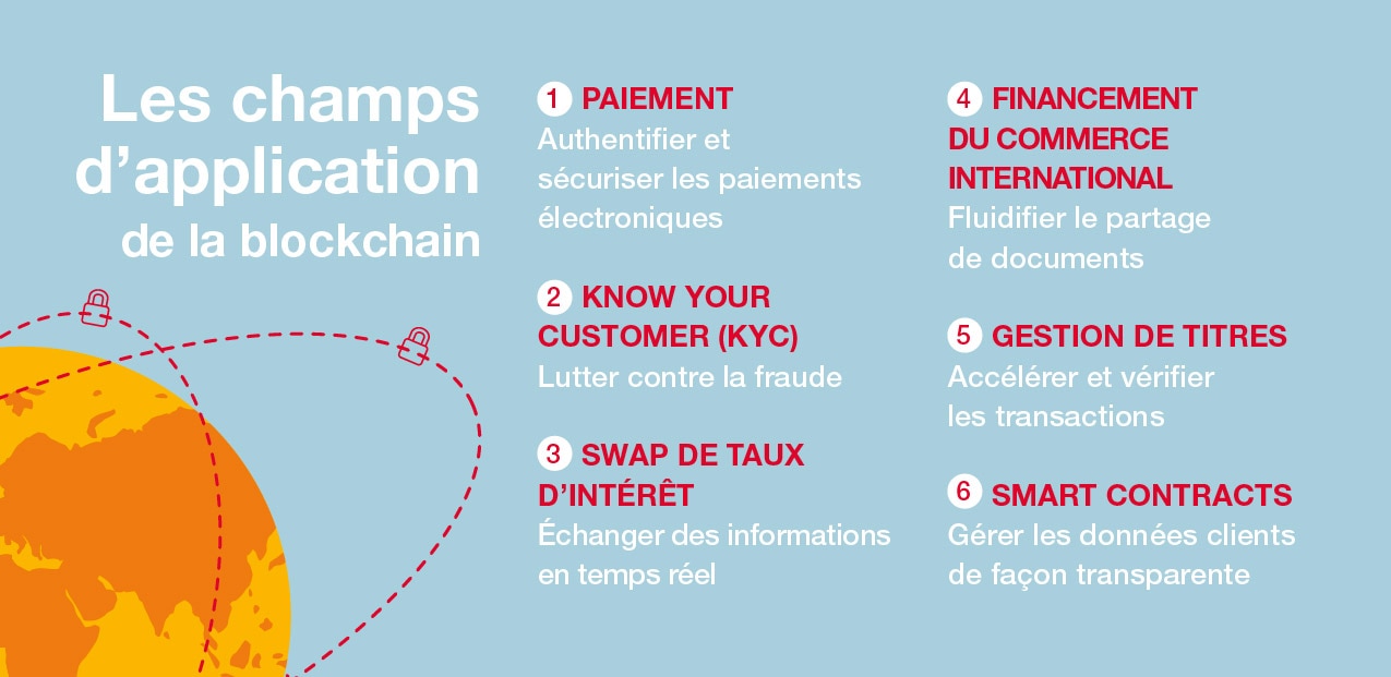 De même, les swaps de taux d’intérêt (produit financier consistant à échanger un taux d’intérêt fixe contre un taux variable) s’en verraient grandement facilités. Avec une technologie blockchain, les deux parties échangent en temps réel sans besoin de tiers de confiance. Même son de cloche du côté du financement du commerce international (ou trade finance) qui implique une grande diversité d’acteurs dans plusieurs pays. Et c’est sans parler de la gestion des titres qui gagnerait en vitesse et en sécurité grâce à une traçabilité sans faille.