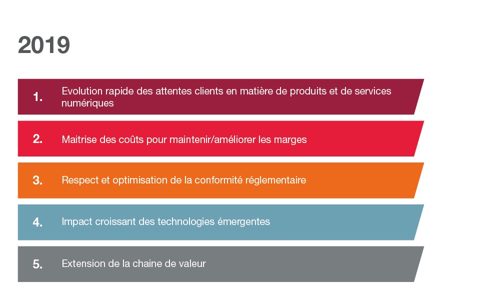 En 2019, nous avons réalisé des entretiens avec 119 dirigeants du secteur de l’assurance. Pour eux, les attentes de leurs clients en matière de services numériques, la conformité réglementaire, la maîtrise des coûts, la cybersécurité et les technologies émergentes constituent des priorités.