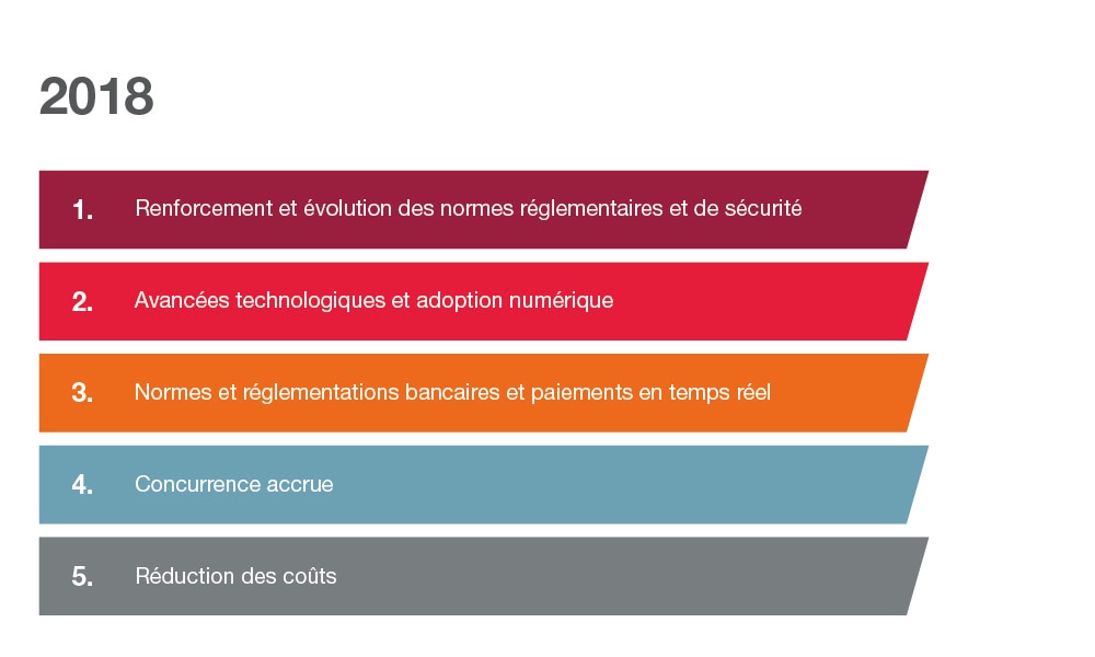 Les normes et réglementations bancaires ainsi que les paiements en temps réel arrivent en 2e position, tandis que les avancées technologiques et l’adoption numérique se placent au 3e rang. Les plateformes opérationnelles en temps réel, résilientes et peu onéreuses, arrivent en 4e position. La réduction des coûts qui permet de s’adapter aux nouveaux modèles bancaires se classe, elle, en 5e position.
