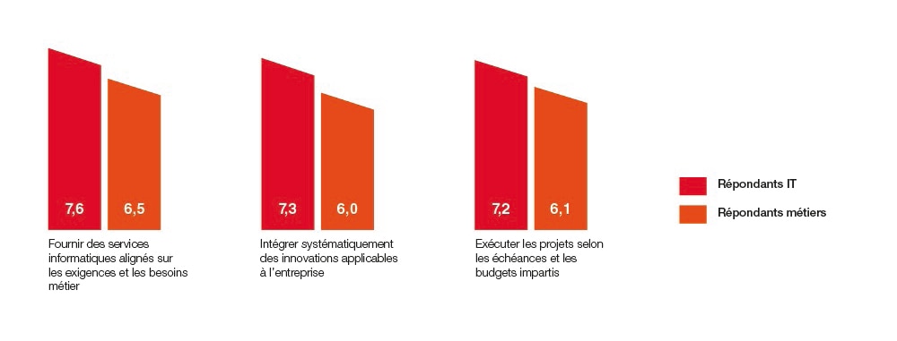 Pour la troisième année consécutive, nous avons demandé aux dirigeants des équipes métiers IT d’évaluer leur satisfaction au sein de leur propre organisation IT en fonction des 10 principaux attributs d’une organisation de TI de classe mondiale. Pour la plupart des attributs, les dirigeants des fonctions métiers indiquent des niveaux de satisfaction moins élevés à l’égard de leurs DSI internes que les directeurs informatiques. La note la plus faible concerne l’intégration systématique des innovations avec 6 sur 10, malgré une hausse de 0,1 point par rapport à 2019.