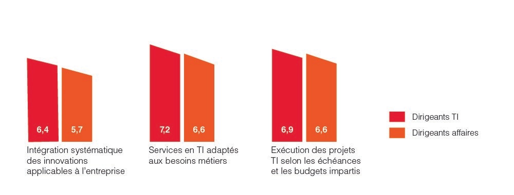 Pour la troisième année consécutive, nous avons demandé aux dirigeants des équipes métiers et IT d’évaluer leur satisfaction au sein de leur propre organisation IT en fonction des 10 principaux attributs d’une organisation de TI de classe mondiale. Pour la plupart des attributs, les dirigeants des fonctions métiers indiquent des niveaux de satisfaction moins élevés à l’égard de leurs DSI internes que les dirigeants informatiques. C’est l’intégration systématique des innovations qui reçoit la note la plus faible de 6,2, même si elle enregistre une hausse de 0,5 point par rapport à 2019.