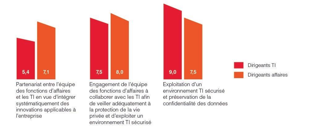 Pour la troisième année consécutive, nous avons demandé aux dirigeants des équipes métiers et IT d’évaluer leur satisfaction au sein de leur propre organisation IT en fonction des 10 principaux attributs d’une organisation IT de classe mondiale. Pour certains des attributs, les dirigeants des fonctions métiers indiquent des niveaux de satisfaction moins élevés à l’égard de leurs DSI internes que les dirigeants IT. Le partenariat entre l’équipe des fonctions métiers et l’équipe IT en vue d’intégrer systématiquement des innovations applicables à l’entreprise affiche l’écart le plus important avec 1,7 point de plus pour les dirigeants des fonctions métiers, soit 1,4 point de plus (+26 %) que l’an dernier.