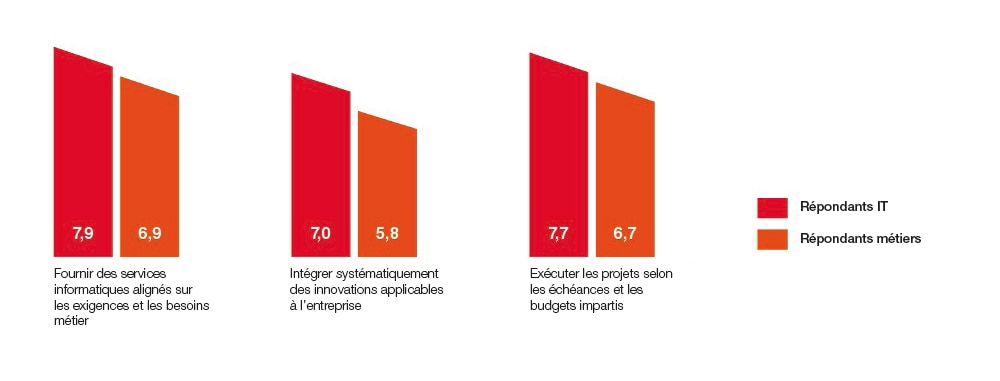 Pour la troisième année consécutive, nous avons demandé aux dirigeants des équipes métiers et IT d’évaluer leur satisfaction au sein de leur propre organisation IT en fonction des 10 principaux attributs d’une organisation de TI de classe mondiale. Pour la plupart des attributs, les dirigeants des fonctions métiers indiquent des niveaux de satisfaction moins élevés à l’égard de leurs DSI internes que les directeurs informatiques. La note la plus faible concerne l’intégration systématique des innovations avec 5,8 sur 10, en baisse de 0,5 par rapport à 2019.