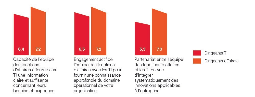 Cette année, nous avons demandé aux dirigeants des fonctions d’affaires (équipes métiers) et informatiques (TI) d’évaluer leur satisfaction au sein de leur propre organisation TI en fonction des 10 principaux attributs d’une organisation de TI de classe mondiale. Pour la plupart des attributs, les dirigeants des fonctions métiers indiquent des niveaux de satisfaction similaires ou supérieurs à l’égard de leurs TI internes que les dirigeants des TI. Le partenariat entre l’équipe des fonctions d’affaires et les TI en vue d’intégrer systématiquement des innovations applicables à l’entreprise est l’attribut qui présente l’écart le plus important quant à la satisfaction (1,7 point), les dirigeants des fonctions TI s’accordant une note de18 % inférieure à celle de l’an dernier.
