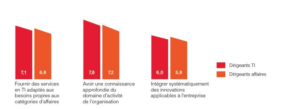 Pour la troisième année consécutive, nous avons demandé aux dirigeants des équipes métiers et IT d’évaluer leur satisfaction au sein de leur propre organisation IT en fonction des 10 principaux attributs d’une organisation de TI de classe mondiale. Pour la plupart des attributs, les dirigeants des fonctions métiers indiquent des niveaux de satisfaction moins élevés à l’égard de leurs DSI internes que les dirigeants informatiques, l’introduction d’innovations concrètes affichant toujours la note la plus faible.