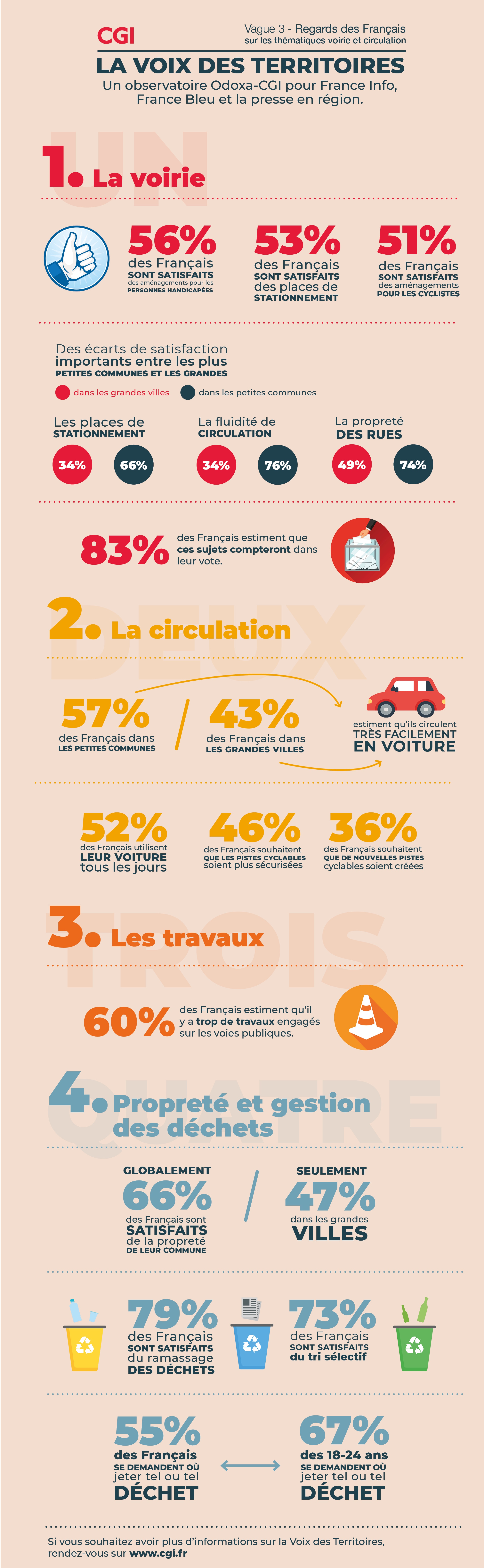 A l'occasion des Municipales 2020, Odoxa et CGI mettent en place un observatoire "la voix des territoires" pour décrypter les tendances majeures des Français. Découvrez l'infographie sur la vague 3 - Regard des Français sur les thématiques voirie et circulation.