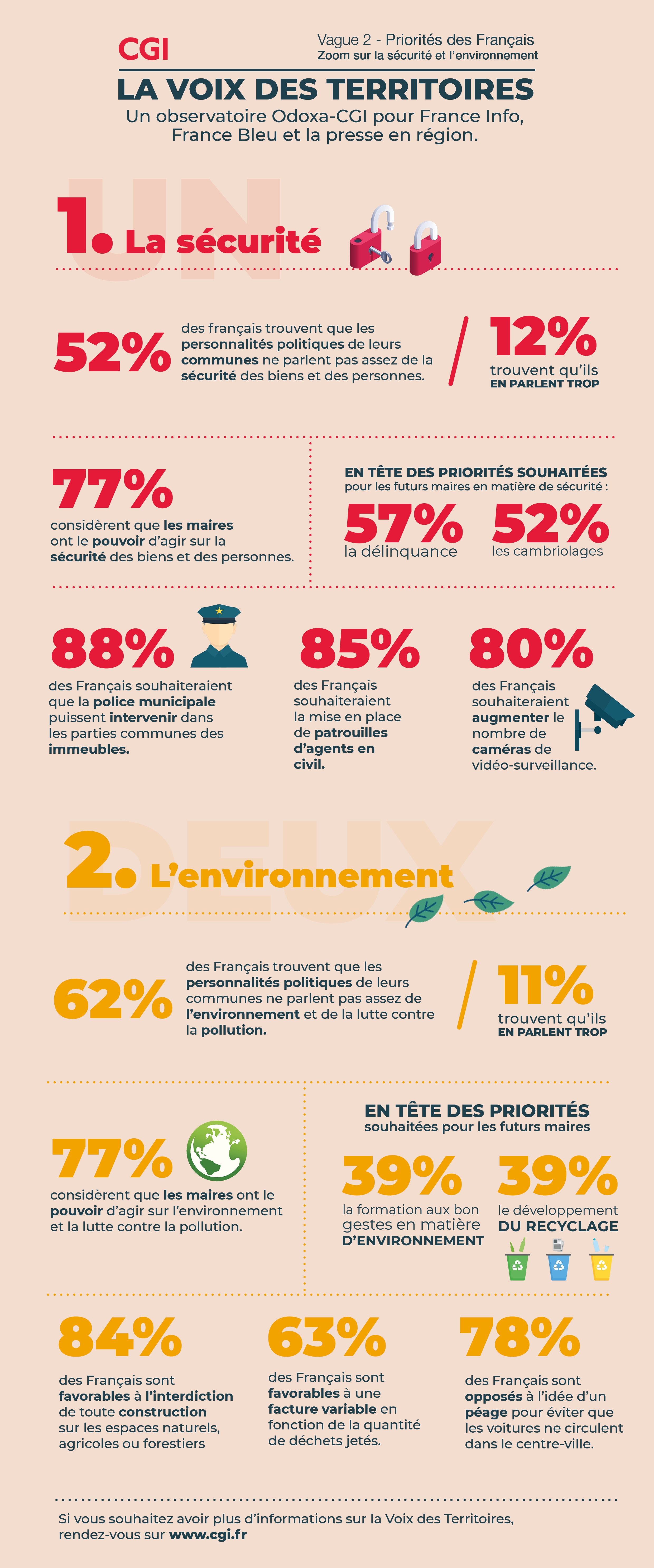 A l'occasion des Municipales 2020, Odoxa et CGI mettent en place un observatoire "la voix des territoires" pour décrypter les tendances majeures des Français. Découvrez l'infographie sur la vague 2 - Priorités des Français, zoom sur la sécurité et l’environnement.