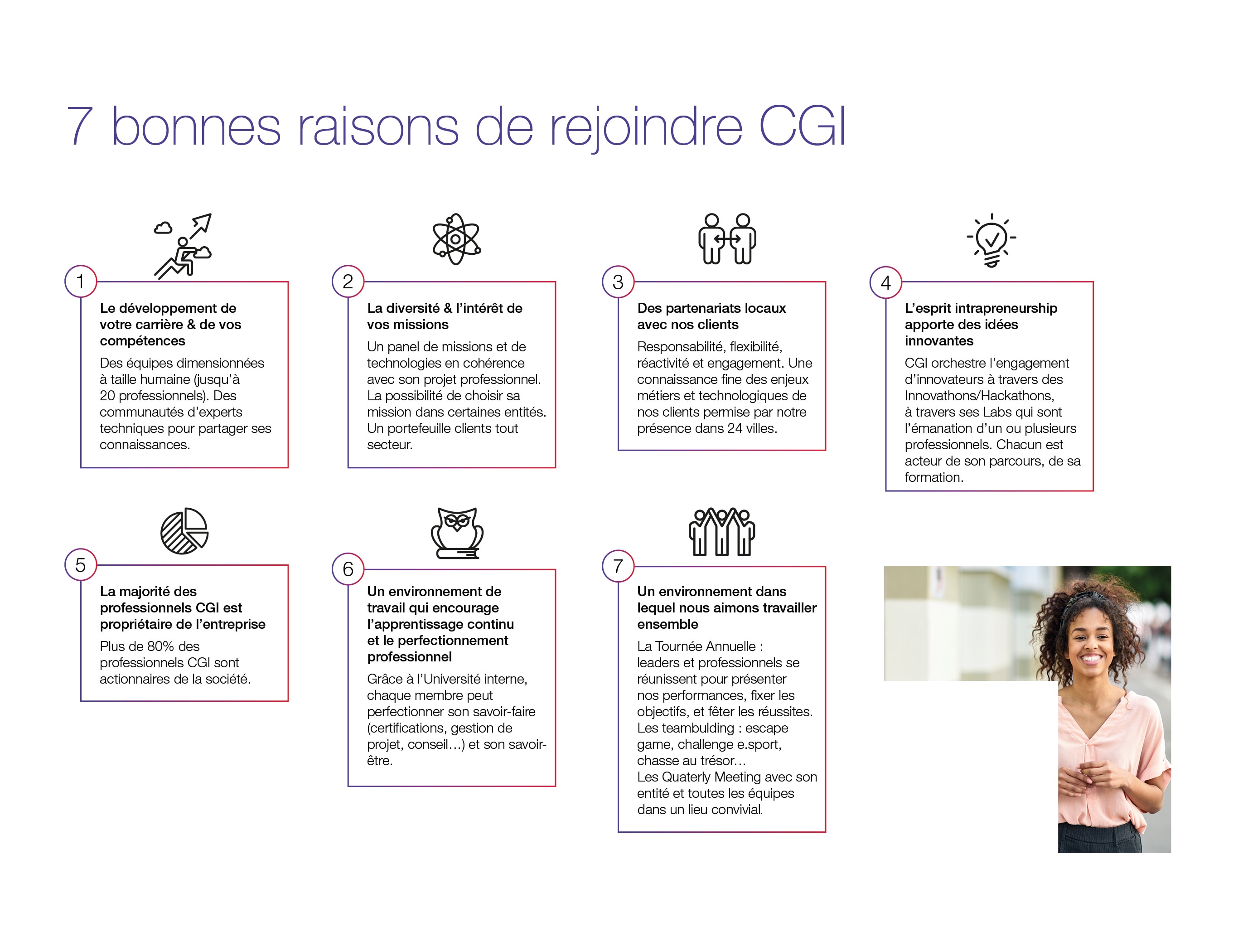 Chez CGI, nous sommes plus que des employés, nous sommes aussi des associés. Si nous utilisons le mot « Associés », ce n’est pas par hasard, nous avons décidé de mettre en avant la culture unique d’actionnaire-propriétaire de CGI.