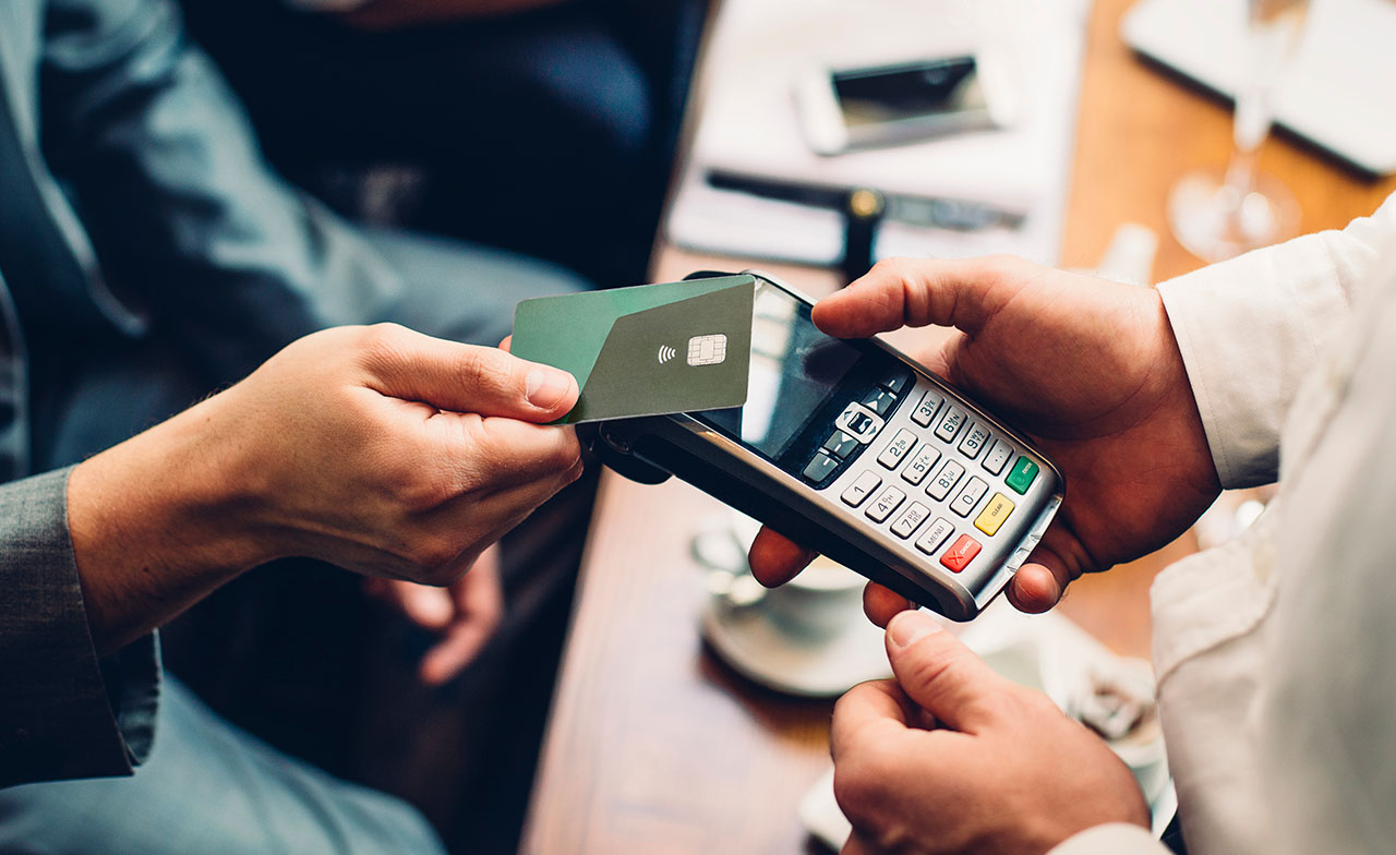 Personne effectuant une transaction en ligne en appuyant sur sa carte de débit