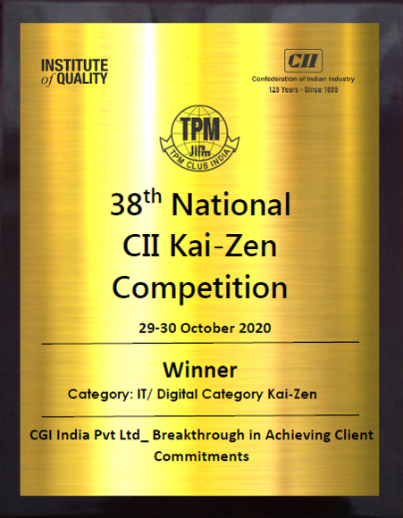 CGI (NYSE: GIB) (TSX: GIB.A) has been recognized by the Confederation of Indian Industry (CII) Institute of Quality as a winner at the 38th National Kaizen competition 2020 for the IT/Digital category in October 2020. The award honours CGI’s implementation of Kaizen to achieve breakthroughs in client commitments.