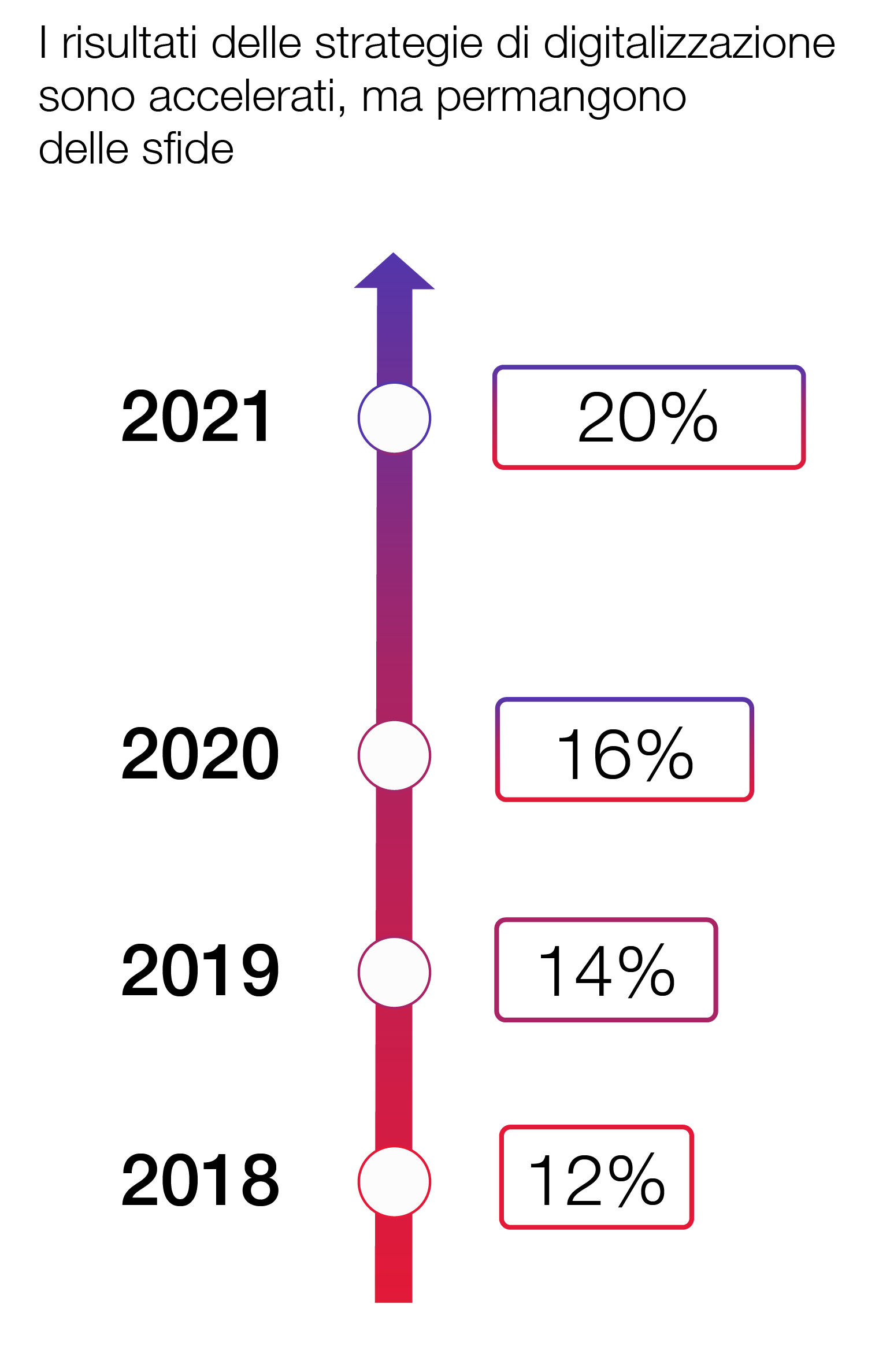 Inoltre, l'84% afferma che il proprio modello di business si sta evolvendo come conseguenza della digitalizzazione. Tuttavia, solo il 20% dei dirigenti intervistati apprezza i risultati delle proprie strategie digitali, rispetto al 16% dello scorso anno.