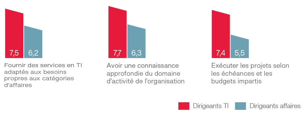 Cette année, nous avons demandé aux dirigeants des fonctions d’affaires (équipes métiers) et informatiques (TI) d’évaluer leur satisfaction au sein de leur propre organisation TI en fonction des 10 principaux attributs d’une organisation de TI de classe mondiale. Dans l’ensemble, la satisfaction à l’égard des TI internes est faible, se chiffrant à 7,1 sur 10. Dans l’ensemble, la satisfaction des dirigeants de ce secteur en matière de TI est plus élevée que dans les autres secteurs et les secteurs bancaires. CGI peut organiser une rencontre avec ses clients sur l’ensemble des analyses comparatives, y compris le positionnement de chaque client, et aborder des sujets tels que la maturité en matière de transformation numérique, les budgets TI, la satisfaction à l’égard des TI, les investissements en innovation, et plus encore. Communiquez avec nous pour en savoir davantage.