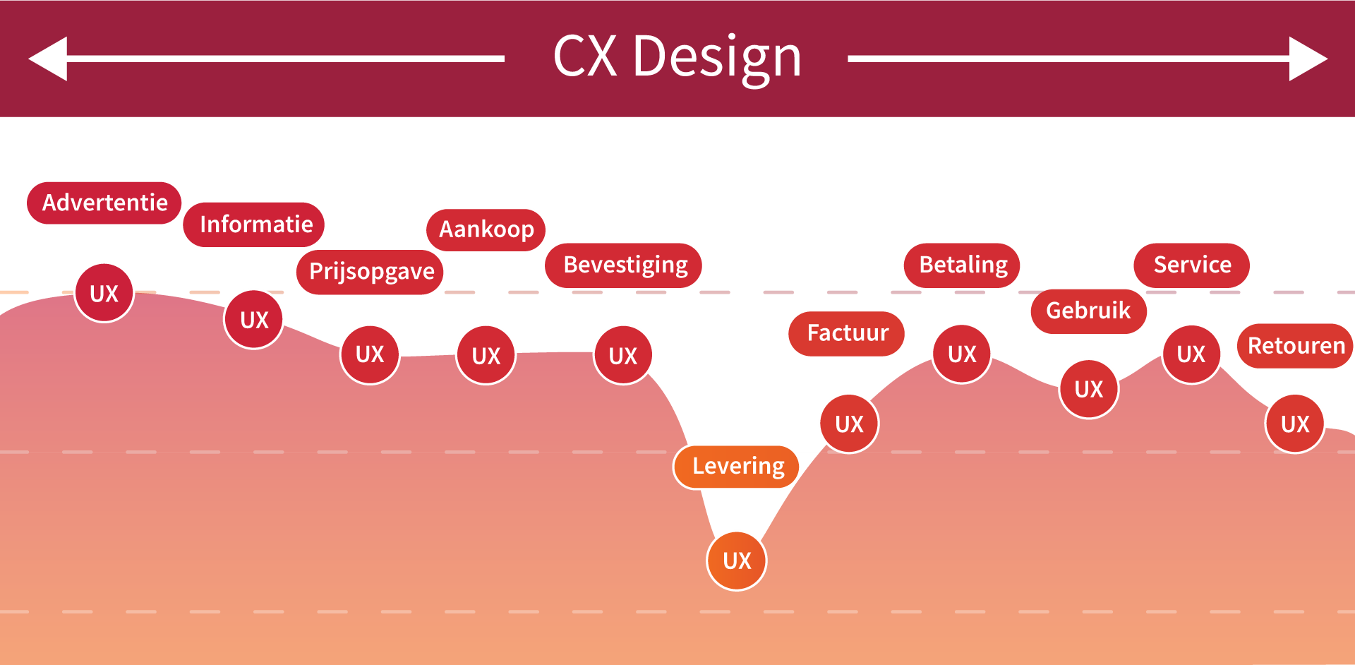 Wat is de relatie tussen CX en UX? Veel mensen zien UX als onderdeel van CX: de beleving van een enkelvoudige interactie (UX) met een digitaal systeem tegenover de beleving van een product of dienst vanaf begin tot eind (CX). Een beleving van een product of dienst kan uit meerdere digitale interacties bestaan zoals hieronder is weergegeven. Vaak wordt dit omgezet in een customer journey (zie onderstaande figuur), waarbij een consistente boodschap en naadloze overgang in de verschillende interacties van wezenlijk belang is.