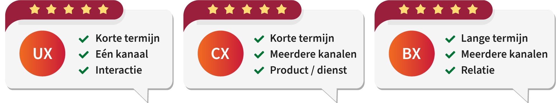 UX, CX en BX hebben hetzelfde doel: een positieve klantbeleving. De UX-designer denkt vaak vanuit gedrag en de menselijke factor. Een CX-designer denkt meer vanuit marketing en klantgroepen. Een relatie-designer (BX) denkt meer in termen van imago, strategie en marktbenaderingen.