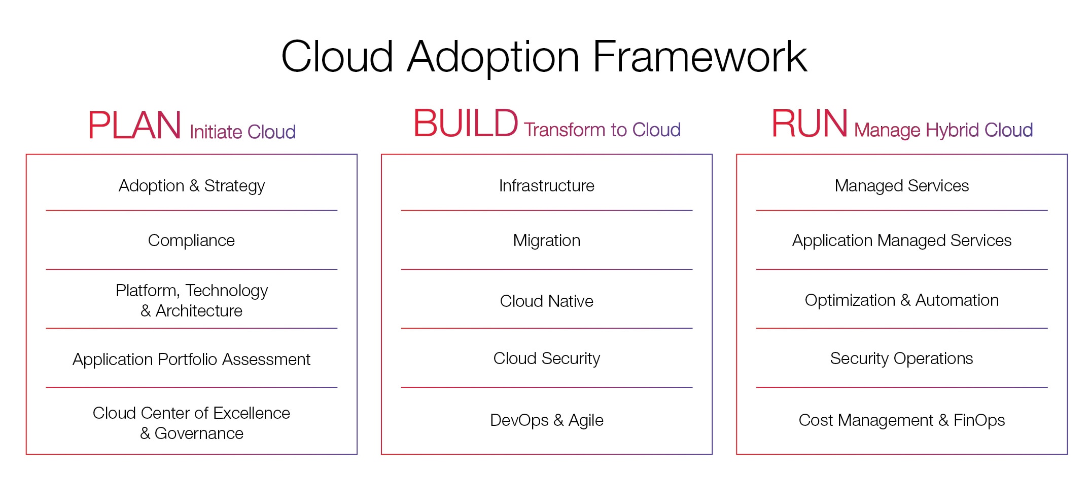 - Arbeider med et gjennomprøvd «cloud adoption framwork» med maler, prosesser, beste praksis og et stort bibliotek av dokumentert kode for rask utrulling av løsninger