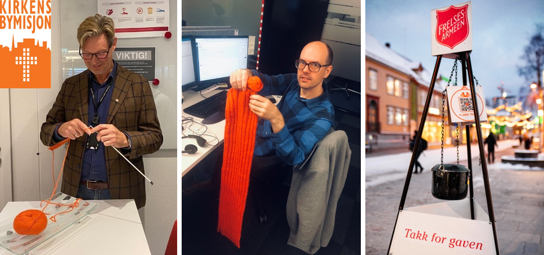 Foto til venstre og midten: Paul Fiskaaen og Øystein Rugland i CGI bidrar i strikkedugnaden til Kirkens Bymisjon.