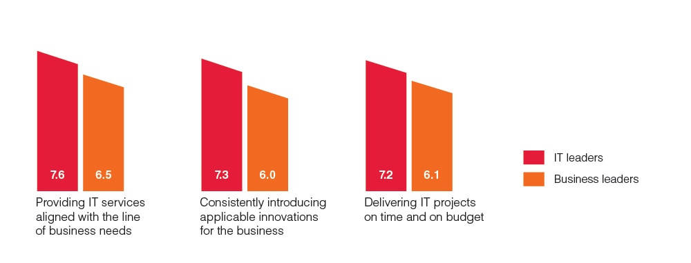 For the third year, business and IT executives interviewed ranked their satisfaction with their own IT organizations based on the 10 key attributes of a world-class IT organization. For most attributes, business leaders report lower satisfaction levels with their internal IT compared to IT leaders. Consistently introducing innovation has the lowest average score at 6, but this is up 0.1 pts from 2019.