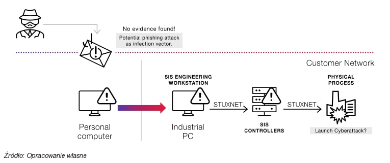 Krytyczne systemy elektrowni nie miały otwartego połączenia z siecią Internet, więc jak Stuxnet do nich dotarł? Najprawdopodobniej atak rozpoczął się w ramach kampanii Phishing’owej, a następnie z osobistego komputera jednego z pracowników elektrowni został przeniesiony na zewnętrznym nośniku danych (pamięć USB) na teren elektrowni. Tam rozprzestrzeniał się w wewnętrznej sieci, zidentyfikował i zainfekował infrastrukturę obsługującą sterowniki, zmienił częstotliwość pracy wirówek, co ostatecznie doprowadziło do ich uszkodzenia i zatrzymania prac nad programem nuklearnym.