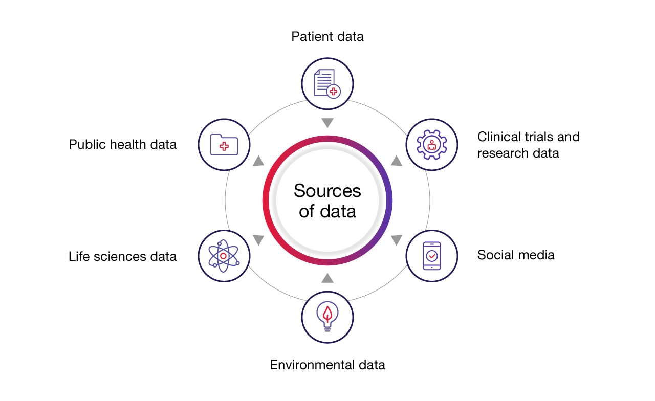 - Patient data: by way of electronic health records (EHR), patient surveys and reports, and also medical devices, wearables, and digital health tools.