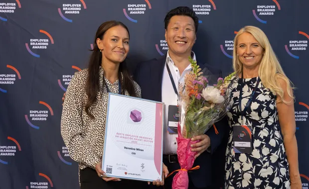 På bilden högst upp på sidan: Linnea Holm, Jens Lee och Larissa Hällefors som tog emot pris för Årets HR-direktör. Årets personaldirektör utses av Universum/Number one varje år och 2023 gick priset till CGIs HR-direktör Veronica Wiren, som tyvärr inte kunde vara på plats och ta emot priset.