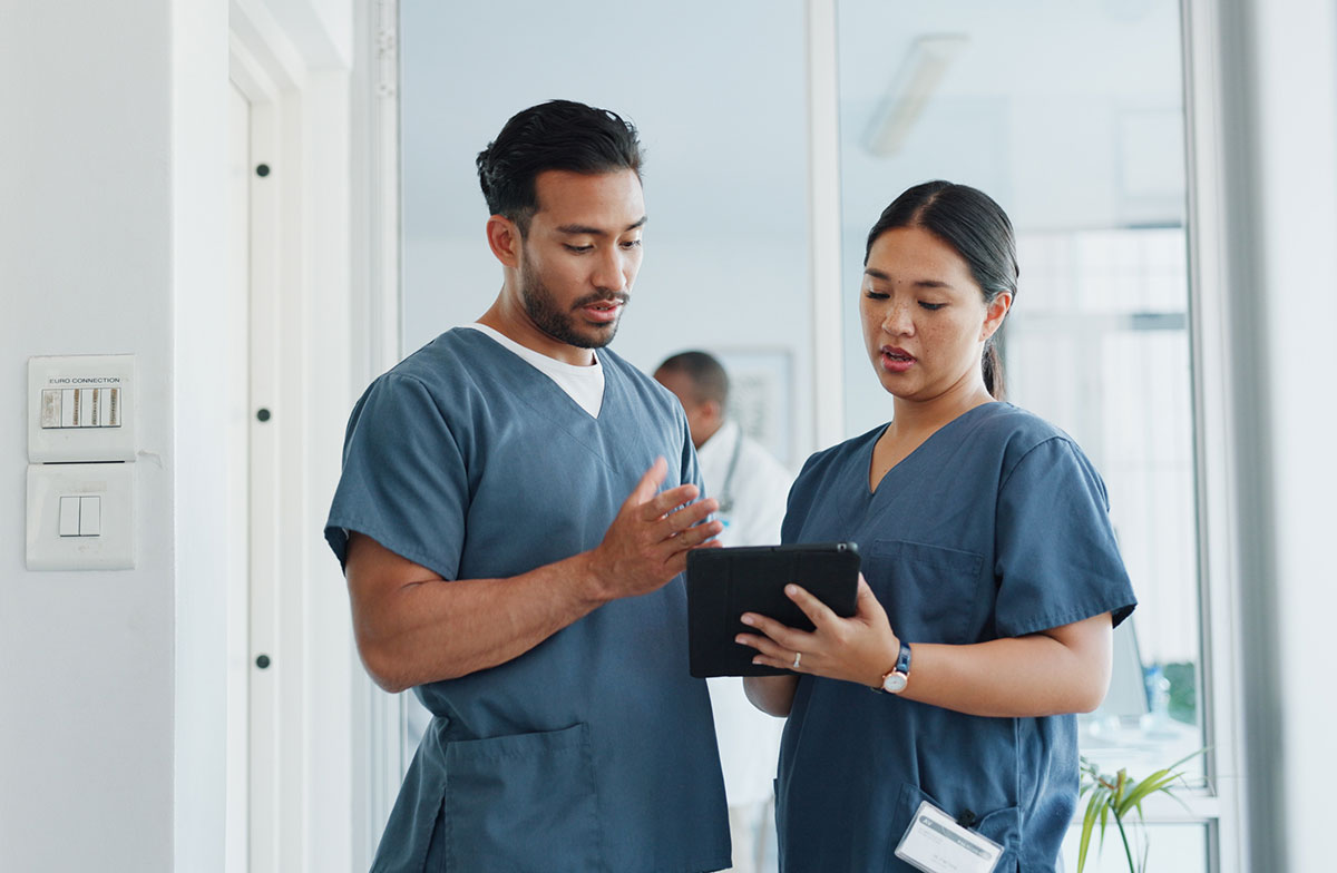 En kvinnlig och manlig sjuksköterska står och diskuterar något på en surfplatta