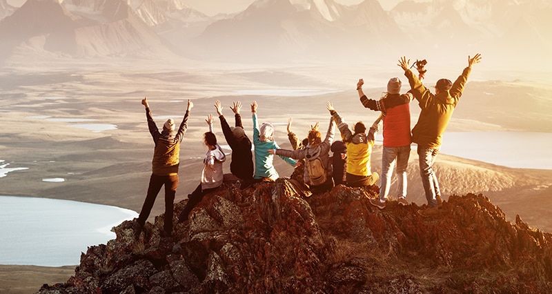 Traineer från CGI Selected programmet står med armarna i skyn och firar att de bestigit en bergstopp samtidigt som de tittar ut över ett fjällandskap med sjöar och toppar
