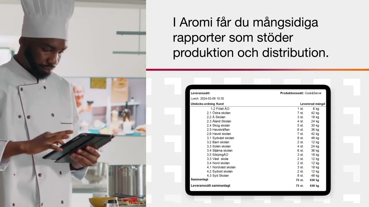 Aromi hanterar alla processer relaterade till livsmedelsproduktion, inklusive produktionsplanering och genomförande, distribution och lagring samt kundgrupps- och säsongsplanering, samtidigt som man minimerar avfall genom historisk information om avfall och förbeställning. Dessutom säkerställs kvalitet och kostnadseffektivitet genom optimerad schemaläggning av utrustning och personal. Centraliserad planering hjälper till att ta fram menyer för enskilda anläggningar och alla detaljer från beställningar, inklusive specialdieter, samlas i en enda instrumentpanel varje vecka.