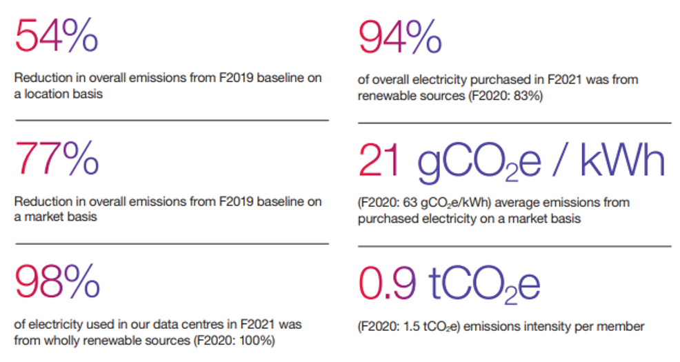 The emissions for F2021 (year ended 30th September 2021) for most scopes showed a continued reduction compared to the prior year. This reflects the impact of the pandemic and the continuation of hybrid working arrangements for many of the company’s employees.