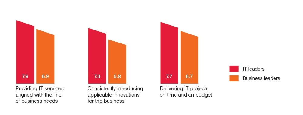 For the third year, business and IT executives interviewed ranked their satisfaction with their own IT organizations based on the 10 key attributes of a world-class IT organization. For most attributes, business leaders report lower satisfaction levels with their internal IT compared to IT leaders. Consistently introducing innovation has the lowest score at 5.8, which is down a further 0.5 pts compared to 2019.