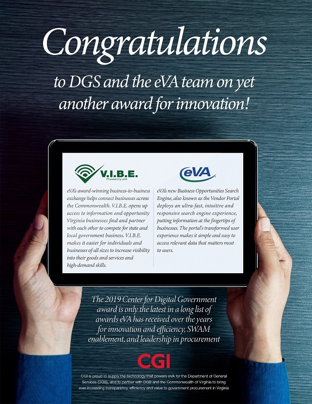 CGI is proud to supply the technology that powers eVA for the Department of General Services (DGS), and to partner with DGS and the Commonwealth of Virginia to bring ever-increasing transparency, efficiency and value to government procurement in Virginia.