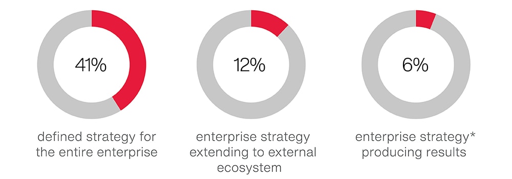 Eighty-five percent of health and life sciences executives indicate having a digital strategy in place, with 32% of those not yet at the enterprise level. Fifty-three percent have strategies for their own enterprise and extending to their external ecosystem, and just 6% of those are producing results, one of the lowest percentages across industries.