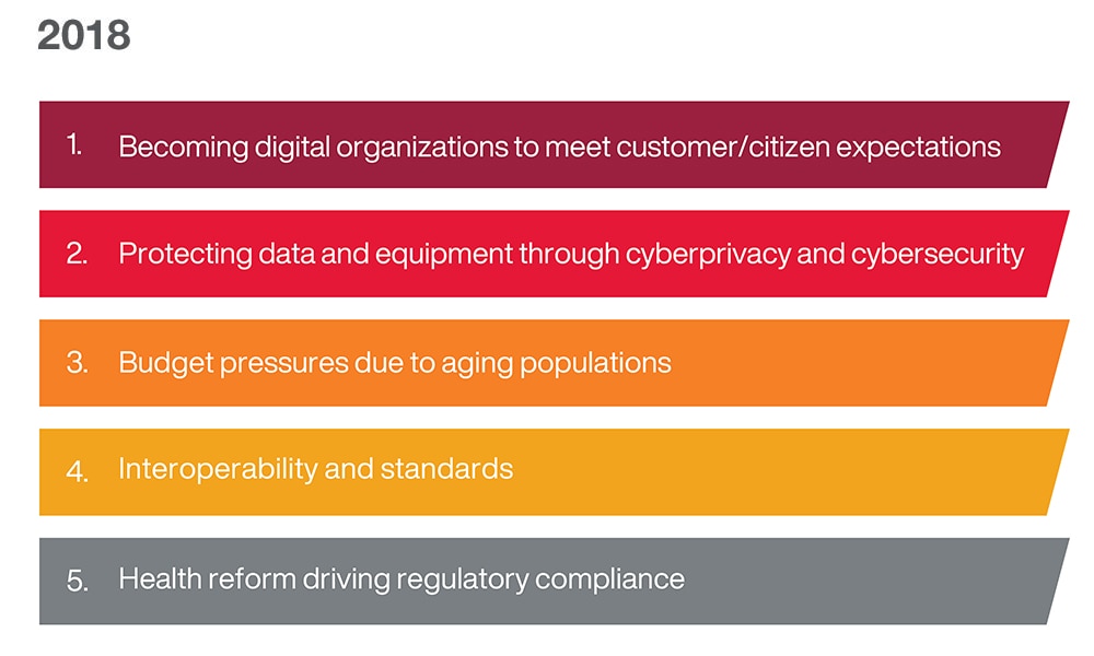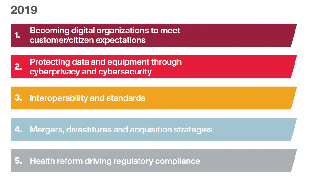 In 2018, transforming the patient and customer digital experience topped the industry trends, followed by cyberprivacy and cybersecurity, budget pressures, mergers and health reform. |