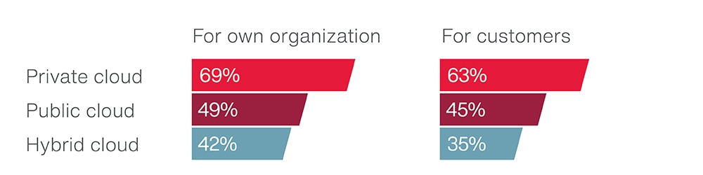 At 86%, health and life sciences executives indicate a level of usage of cloud-based solutions that exceeds the global average across industries (76%), outpacing most sectors. Additionally, they indicated how their organization’s cloud usage is divided between private, public and hybrid clouds (as shown in the above chart). When asked if their organization has mechanisms in place to locate where key data assets are stored in the cloud, 36% do not have clarity on this question.