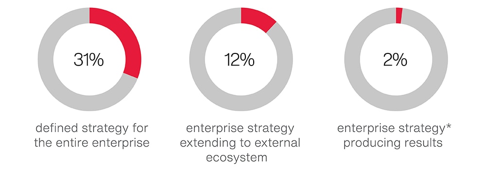 When asked if their organization has a defined digital transformation strategy, 80% of executives answer yes. Of those, 31% report the strategy is enterprise-wide, and 12% report it also extends to external ecosystem partners. Of those with an enterprise-wide strategy, only 2% report that strategy is producing results.